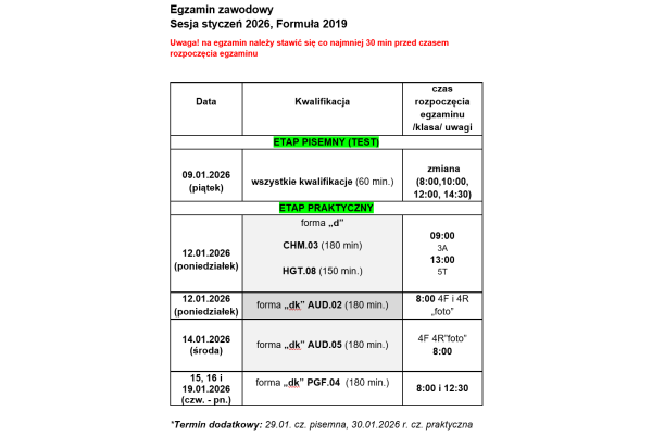 Terminy główne egzaminu zawodowego w styczniu 2026. Indywidualne harmonogramy: dzień, godzina, miejsce egzaminu- dostępne na koncie egzaminacyjnym zdającego po zalogowaniu w systemie SIOEPKZ: https://portalzdajacego.epkz.cke.edu.pl/Account/Login