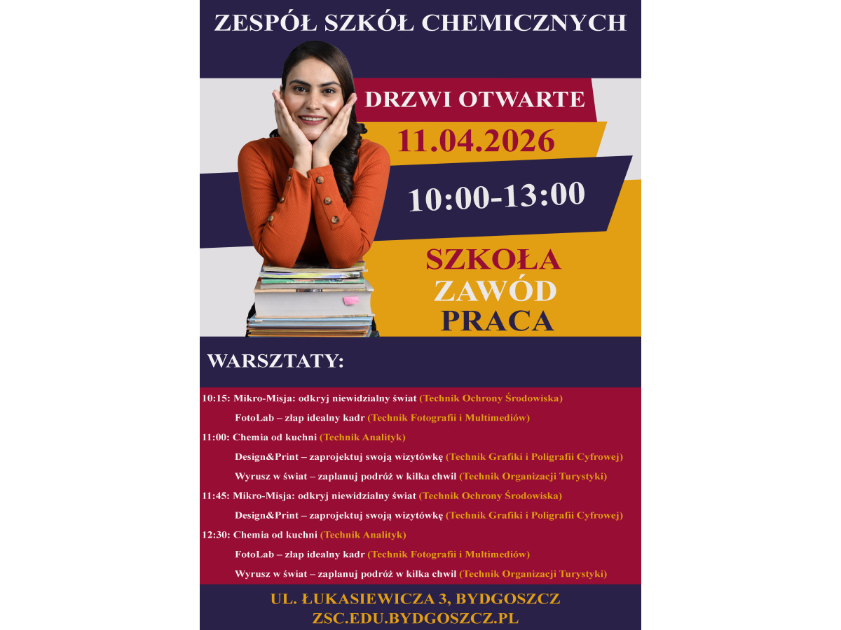 Już 11 kwietnia 2026 roku, w godzinach 10:00–13:00, odbędą się Drzwi Otwarte w naszej szkole. Zapraszamy, by zobaczyć, jak wygląda nauka w praktyce. Dodatkowo przygotowaliśmy dla wszystkich chętnych warsztaty, aby każdy mógł sprawdzić, co go najbardziej interesuje. Zapraszamy do odwiedzenia naszej szkoły, poznania jej atmosfery i spędzenia tego czasu razem z nami!